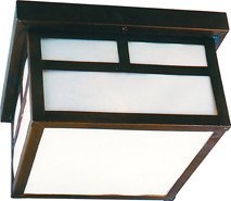 This attractive outdoor ceiling fixture features a simple, squared framework with a burnished copper finish. Panels of white frosted glass contrast nicely with the dark finish for additional aesthetic appeal. This fixture is ideal for a porch, patio, or gazebo. Uses one 60-watt bulb (available separately). DL # 5282.